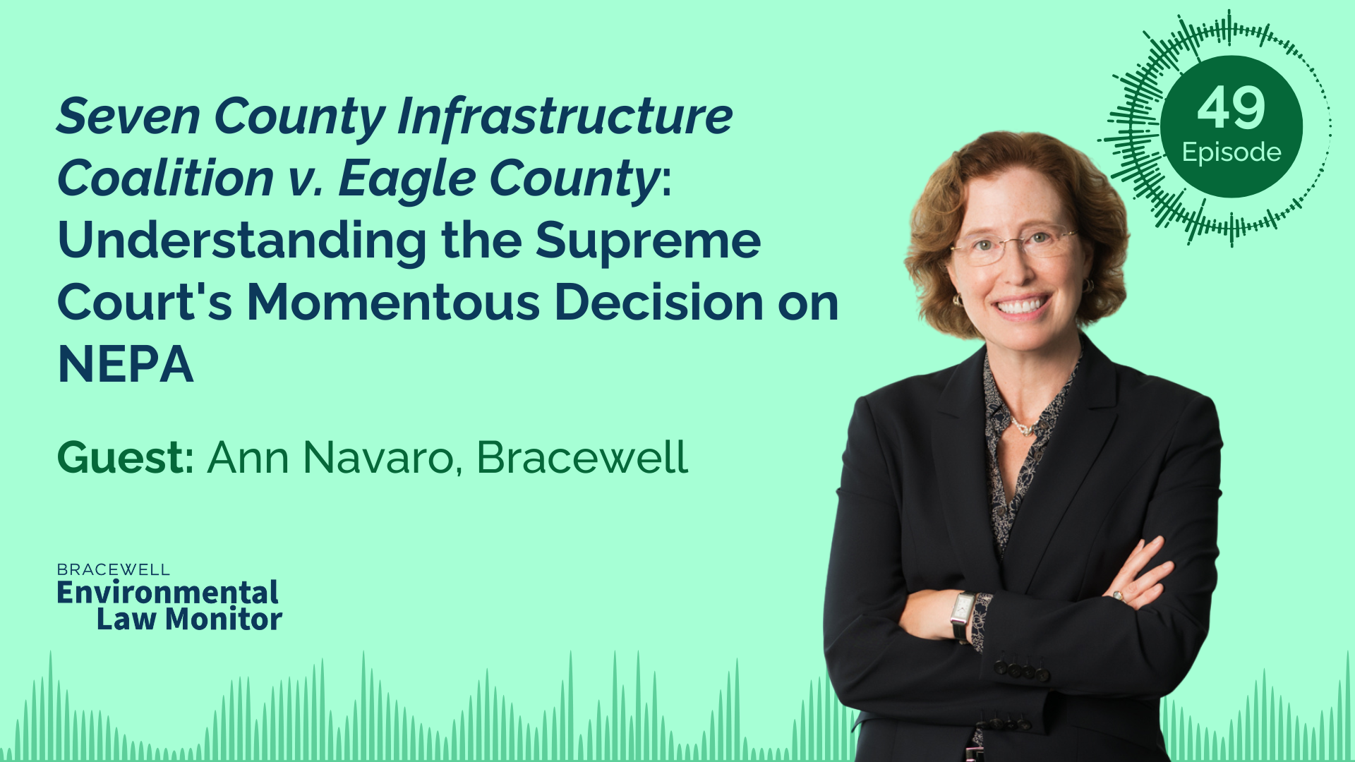 In this episode of the Bracewell Environmental Law Monitor, Ann Navaro joins hosts Daniel Pope and Taylor Stuart to discuss the implications of the Supreme Court’s ruling in Seven County Infrastructure Coalition v. Eagle County. They delve into the ruling’s clarifications on judicial deference and an agency’s obligations under NEPA. The trio also examine the potential impacts on infrastructure projects in light of this decision.